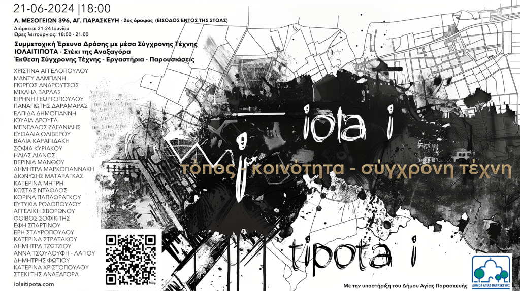 Η ανοιχτή πρωτοβουλία καλλιτεχνών και επιστημόνων ΙΟΛΑΙΤΙΠΟΤΑ σε συνεργασία με το Στέκι της Αναξαγόρα σας προσκαλούν σε μια σειρά εκδηλώσεων εστιασμένων στον Τόπο την Κοινότητα και την Σύγχρονη Τέχνη. Έκθεση εικαστικών έργων, παρουσίαση συμμετοχικών εργαστηρίων, εισηγήσεις – συζητήσεις, αρχεία, σε μια διάταξη αλληλεπίδρασης, ανασύρουν στοιχεία από την ιστορία του τόπου και τη μνήμη της κοινότητας, με σκοπό τη δημιουργική σύμπραξη των κατοίκων.