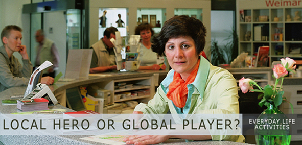 Σ’ αυτήν την εγκατάσταση Μια ξένη στην πόλη μας! Πρακτικές εικαστικής παρέμβασης στη γειτονιά-εφήμερες γλυπτικές και άλλες κατασκευές σε δημοσίους & κοινοχρήστους χώρους, παρουσιάζω με μια συνοπτική ματιά 5 ατομικά σχεδιασμένα καλλιτεχνικά εγχειρήματα από την παρελθοντική μου δράση σε τρεις ευρωπαϊκές πόλεις: Βαϊμάρη, Βενετία, Αθήνα. Είναι οι αποτυπώσεις δημόσιων παρεμβάσεων, προσωρινών επιτόπιων εγκαταστάσεων σε δημόσιους και κοινόχρηστους χώρους της πόλης, μιας εφήμερης κατοίκου που προσπαθεί να γίνει ντόπια χωρίς ποτέ να τα καταφέρνει ακριβώς. Οι εγκαταστάσεις συνήθως είναι μεγάλων μεγεθών, φτιαγμένες με πολλές διαφορετικές τεχνικές και πολλά μεικτά υλικά. Τοποθετημένες, σταθερές και μεταβαλλόμενες σε χώρους παιχνιδιού για παιδιά, σε κεντρικούς χώρους στάθμευσης της πόλης, σ’ έναν τοίχο σχεδιασμένο από τον αρχιτέκτονα Luigi Snozzi, μεταφερόμενες σε ένα τρίκυκλο σε μια ψυχογεωγραφική διαδρομή που διασχίζει βιομηχανικούς χώρους, σε μια διαδικασία εξερεύνησης χώρους εργασίας/περάσματα του ξένου στο οικείο, κ.άλ, οι εγκαταστάσεις συνοδεύονται πάντα από παράλληλες δράσεις, από συνομιλίες με τους περίοικους για το καλλιτεχνικό έργο, ενίοτε την τοπική γλώσσα την αλλά και την ιστορία του τόπου. Χρησιμοποίησα πολλές διαφορετικές τεχνικές και πάρα πολλά μεικτά υλικά. Άλλοτε εκτυπώσιμα πλαστικά φύλλα και φωσφορούχο χρώμα φθορισμού, καθώς και σύστημα ηλεκτρικού φωτισμού με προβολείς. Άλλη φορά καρφιά, σπάγκο για αρχιτεκτονικές μετρήσεις, κιμωλίες, και χαρτιά, καθώς και για εργαλεία μια πυξίδα κι ένα σφυρί. Η διάρκεια των παρεμβάσεων ήταν από 7 ημέρες ως και 2 μήνες. Παρουσιάστηκαν στην περιοχή Neues Bauern am Horn & στην περιοχή Stadionvorplatz στη Βαϊμάρη-Γερμανία τον Ιούνιο του 2004, σε εναλλακτικούς εκθεσιακούς χώρους καθώς και ως δικτυακή ιστοσελίδα στο internet.