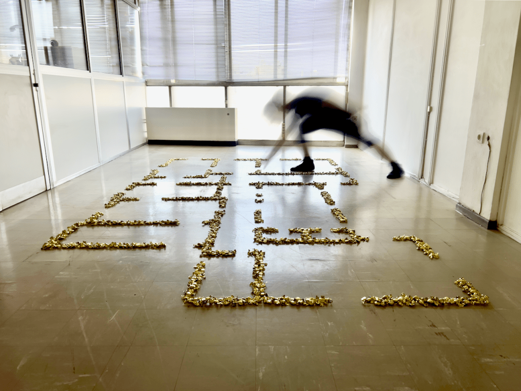 Κάτοψη της βίλας Ιόλα από καραμέλες με χρυσό περιτύλιγμα. Η χρήση του χρυσού χρώματος παραπέμπει στην αίγλη και στην πολυτέλεια που χαρακτήριζε την οικία κατά την ακμή της, μιμούμενη την ελκυστικότητα και την αύρα πλούτου που την περιέβαλε.