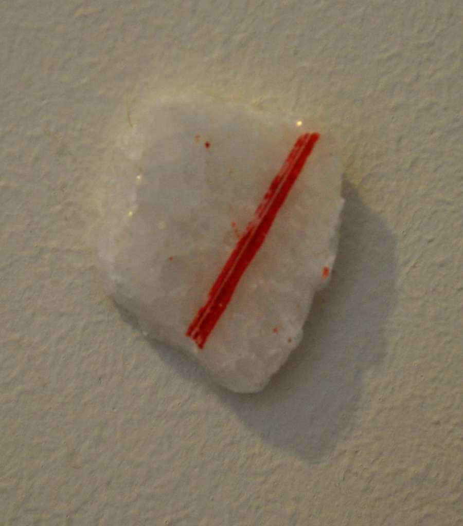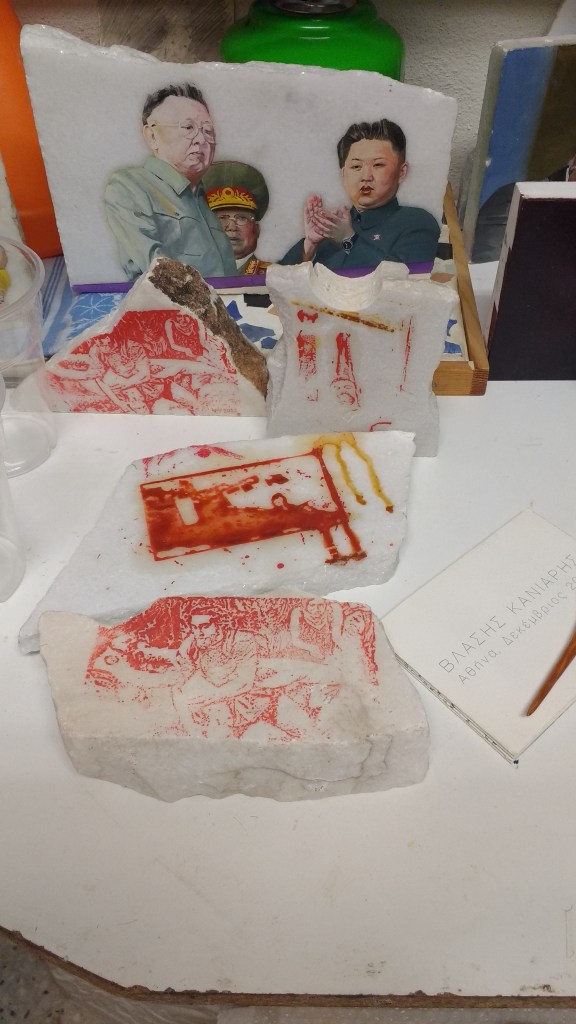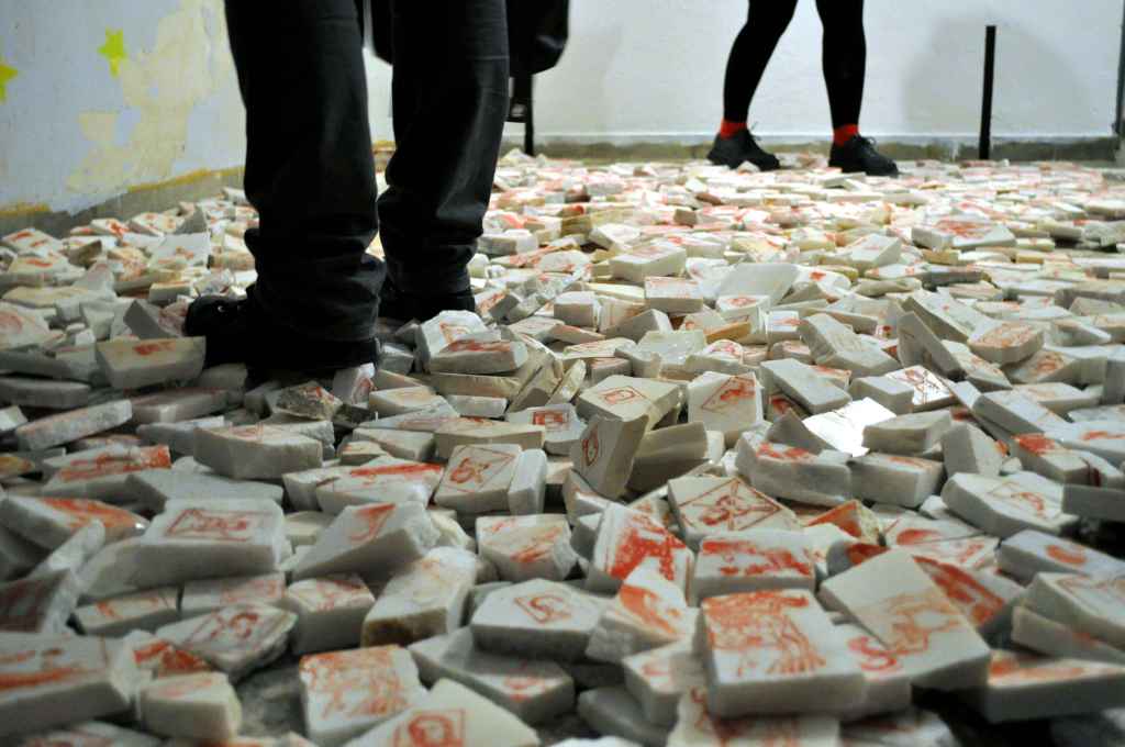 Το έργο “Εντυπώσεις – Εντυπώσεις”, αποτελείται από λευκά θραύσματα μαρμάρων τα οποία έχουν σφραγιστεί με εικόνες που κυριαρχούν στα Μ.Μ.Ε.