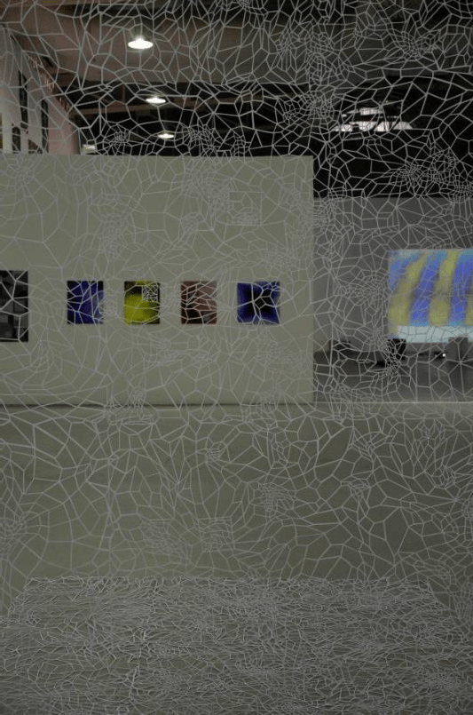 Τεχνικά χαρακτηριστικά έργου: τελάρο χαρτιού πλαισιωμένο σε παράθυρο της οικίας. Με ανοίγματα διαφόρων μεγεθών.
