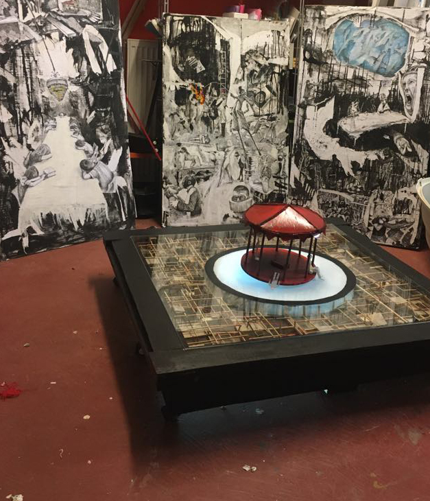 Η επιδαπέδια κατασκευή έχει αναφορά στο καρουζέλ του Ακριθάκη όπως και τα κολάζ έχουν στοιχεία από τα σχέδια ‘’τσικί-τσίκι‘’ του ίδιου καλλιτέχνη. Στην εγκατάσταση θα υπάρχουν και άλλα δύο κείμενα που θα έχουν συμβολική αναφορά στον Ιόλα, ’’Ο Μάγος’’ και το ‘’Το γεύμα’’.