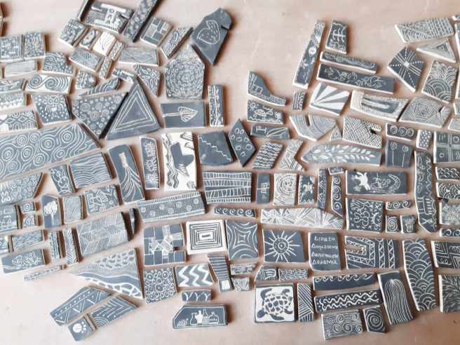 Μετά από παρουσίαση κατασκευής αντικειμένων στον τροχό και τη διαδικασία ψησίματος στο καμίνι σε σπασμένα κομμάτια ωμού αλλά στεγνού πηλού τα οποία μπατανίσαμε και στα οποία με Sgraffito (χάραξη) δημιουργήσαμε μέσα από μνήμες, μετακινήσεις ανθρώπων και παραδόσεις του τόπου ότι ο κάθε ένας ένιωθε, παλιοί και νέοι φίλοι για τη συλλογική ευημερία και την κοινωνική συνοχή. Τέλος συνθέσαμε ένα νέο χάρτη της περιοχής (επανασύνδεση) αφού όμως ψήθηκαν όλα τα κομμάτια – θραύσματα.