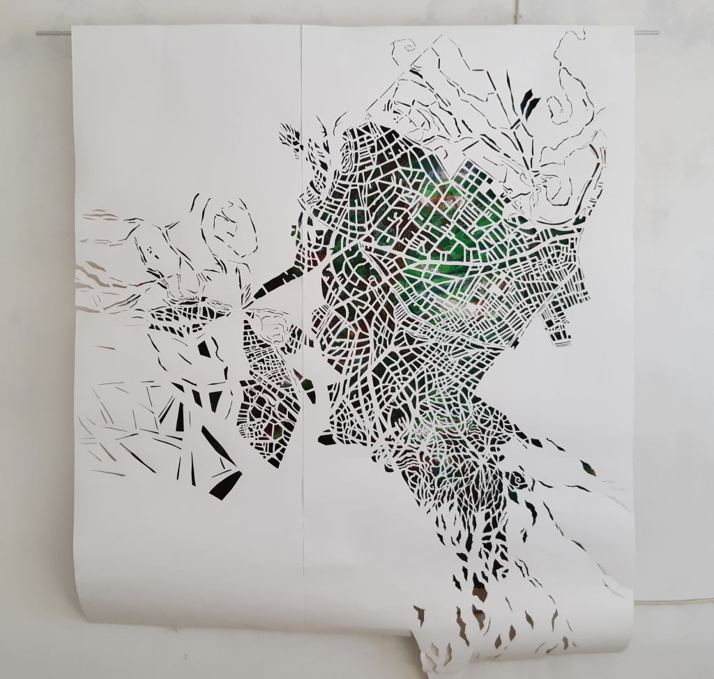 Δύο επάλληλα χαρτιά, το ένα ζωγραφισμένο, το άλλο κομμένο με τρόπο που να φαίνονται αποσπάσματα του προηγούμενου. Τα κοψίματα ακολουθούν ένα τοπογραφικό σχέδιο που εκκινεί από αυτό της Αγίας Παρασκευής και μετατρέπεται σε κάτι άλλο. Ίσως θυμίζει λαβύρινθο, ιστό αράχνης, δίκτυο, νευρώνες, δέντρο· με διακλαδώσεις, συσσωρεύσεις και αραιώσεις. Θα μπορούσε να είναι το φανταστικό τοπογραφικό μίας «αόρατης» πόλης.