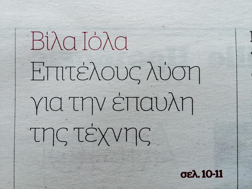 ΔΙΠΛΟ ΑΦΙΕΡΩΜΑ,σημερα ΚΥΡΙΑΚΗ 10 Σεπτεμβριου στον Τύπο,για την αποφαση ΑΠΟΚΤΗΣΗΣ ΤΟΥ ΚΤΗΜΑΤΟΣ ΚΑΙ ΤΗΣ ΒΙΛΑΣ ΙΟΛΑ απο το ΔΗΜΟ ΑΓΙΑΣ ΠΑΡΑΣΚΕΥΗΣ: Οι εφημερίδες «ΤΟ ΒΗΜΑ ΤΗΣ ΚΥΡΙΑΚΗΣ» και «Documento» με ολοσέλιδο και δισέλιδο,αντίστοιχα,ΡΕΠΟΡΤΑΖ αναδεικνύουν την ΜΕΓΑΛΗ ΠΟΛΙΤΙΣΤΙΚΗ ΑΞΙΑ του ακινήτου,με συνεντεύξεις και λεπτομέρειες!
