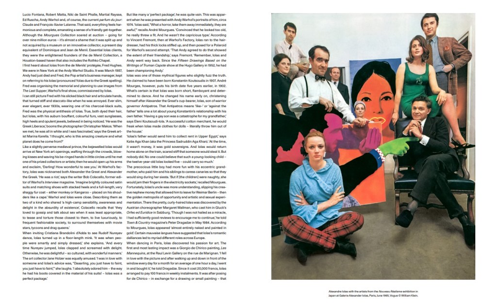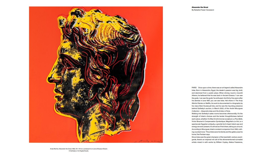 Μια φορά κι έναν καιρό, υπήρχε ένας θρύλος της τέχνης που λεγόταν Αλέξανδρος Ιόλας. Γεννημένος στην Αλεξάνδρεια της Αιγύπτου, το πάθος του εμπόρου τέχνης ήταν μεγάλο, τολμηρό, με ποιητικές καταβολές. Όταν οδηγούσε στη φεγγαρόλουστη Αθήνα, πίστευε ότι βρισκόταν στην Αρχαία Ελλάδα. «Μπορώ να δω τους θεούς, μπορώ να δω τους θεούς», έλεγε με ενθουσιασμό. Μπορείς να δεις τον Ιόλα ακόμα και 35 χρόνια μετά το θάνατό του, τον Ιούνιο του 1987. Είναι εκεί στο The Andy Warhol Diaries του Netflix, το έργο του τεκμηριώνεται σε βιογραφία από την ανιψιά του, Ελένη Κουτσούδη-Ιόλα, εκείνος ήταν η στοιχειωμένη παρουσία πίσω από τη δημοπρασία της Συλλογής André Mourgues – Ο Αλέξανδρος Ιόλας και οι καλλιτέχνες του στο Sotheby’s τον Μάρτιο του 2022, στο Παρίσι.