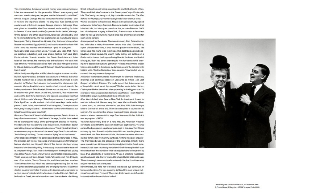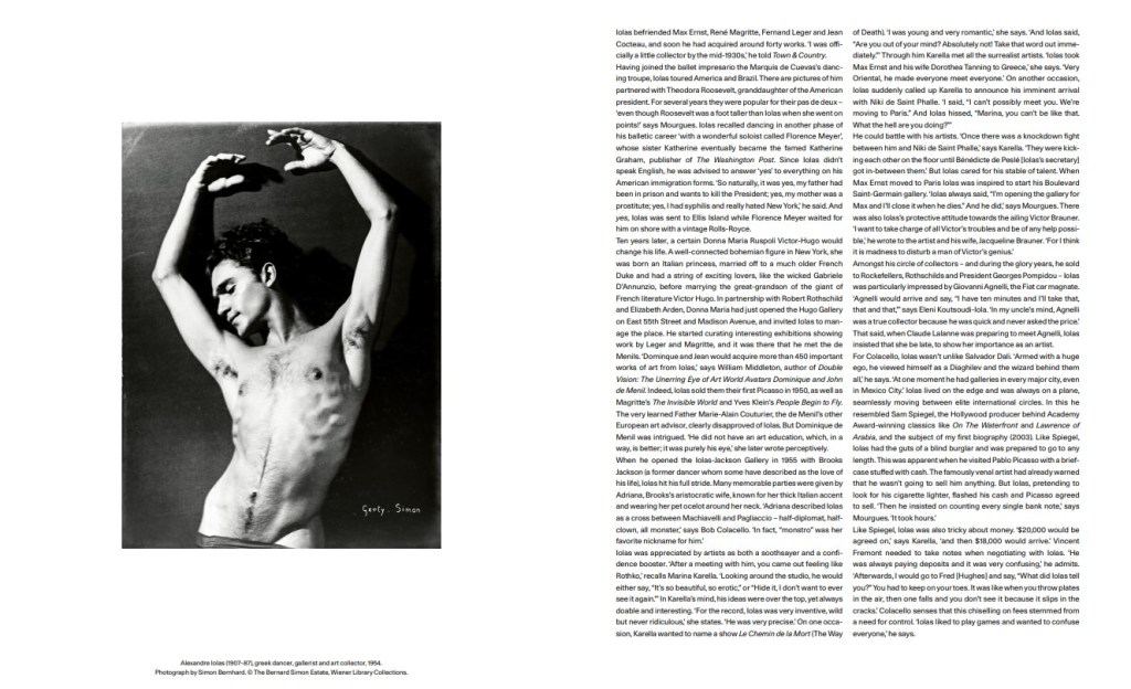 αργήσει, για να υπογραμμίσει τη σπουδαιότητά της ως καλλιτέχνις. Για τον Colacello, ο Ιόλας δεν ήταν πολύ μακριά από τον Salvador Dali. «Οπλισμένος με τεράστιο εγωισμό, έβλεπε τον εαυτό του ως έναν άλλο Diaghilev, ως τον θαυματοποιό πίσω από τον καθέναν τους», λέει. «Κάποτε είχε γκαλερί σε κάθε μεγάλη πόλη, ακόμα και στην Πόλη του Μεξικού.» Ο Ιόλας ζούσε στα άκρα και ήταν πάντα σε ένα αεροπλάνο, κινούμενος αδιάκοπα μεταξύ κύκλων διεθνών ελίτ. Σε αυτό έμοιαζε με τον Sam Spiegel, που αποτέλεσε το θέμα της πρώτης μου βιογραφίας (2003), τον παραγωγό του Χόλιγουντ πίσω από τις κλασικές ταινίες που έχουν βραβευθεί με Όσκαρ, όπως το On The Waterfront και το Lawrence of Arabia. Όπως ο Spiegel, ο Ιόλας είχε τα κότσια τυφλού διαρρήκτη και ήταν έτοιμος να κάνει τα πάντα. Αυτό έγινε εμφανές όταν επισκέφθηκε τον Pablo Picasso με ένα χαρτοφύλακα γεμάτο μετρητά. Ο ως γνωστόν φιλοχρήματος καλλιτέχνης είχε ήδη προειδοποιήσει ότι δεν επρόκειτο να του πουλήσει τίποτα. Αλλά ο Ιόλας, προσποιούμενος ότι έψαχνε τον αναπτήρα του, άφησε στιγμιαία να φανούν τα μετρητά και ο Picasso συμφώνησε να πουλήσει. «Μετά επέμενε να μετρήσει κάθε χαρτονόμισμα ξεχωριστά», λέει ο Mourgues. «Κράτησε ώρες.» Όπως ο Spiegel, ήταν και ο Ιόλας πονηρός με τα χρήματα. «Συμφωνούσαμε στα 20.000 δολλάρια», λέει η Καρέλλα, «και έφταναν εδώ οι 18.000.» Ο Vincent Fremont έπρεπε να κρατά σημειώσεις όταν διαπραγματευόταν με τον Ιόλα. «Πάντα πλήρωνε προκαταβολές και ήταν πολύ περίπλοκο», παραδέχεται. «Μετά, πήγαινα στον Fred [Hughes] και του έλεγα, “Τι σου είπε ο Ιόλας;” Έπρεπε να είσαι σε εγρήγορση. Ήταν όπως όταν πετάς πιάτα στον αέρα, κάποιο πέφτει και δεν το βλέπεις γιατί γλιστράει στις χαραμάδες.» Ο Colacello διαισθάνεται ότι αυτός ο σφετερισμός χρημάτων προήλθε από μια ανάγκη για έλεγχο. «Του άρεσε να παίζει παιχνίδια, ο Ιόλας ήθελε να μπερδεύει τους πάντες», λέει. Αυτή η χειριστική συμπεριφορά σχετικά με τα χρήματα ήταν παράξενη επειδή ο Ιόλας ήταν γνωστός για τη γενναιοδωρία του. «Όταν ήμουν νέος και άγνωστος σχεδιαστής εσωτερικών χώρων, μου έδωσε το κρεβάτι Lalanna Cocodoll», αποκαλύπτει ο Jacques Grange. «Έδωσε επίσης οδηγίες στην Pauline Karpidas – μία από τις νέες και σημαντικές πελάτισσές του – να φοράει μόνο Yves Saint Laurent και να ζει μόνο σε εσωτερικούς χώρους Jacques Grange.» Ένα απίστευτο έργο τέχνης του Max Ernst δόθηκε στην Katie Aga Khan ενώ εργαζόταν για τον Ιόλα στη Γενεύη. «Είναι το καλύτερο από την περίοδό του, Époque des forêts», λέει η ίδια. Σε αντίθεση με τον Spiegel και άλλους αξιοσπούδαστους ανθρώπους, ο Ιόλας φερόταν απίστευτα καλά στην άμεση οικογένειά του. «Τον εκμεταλλεύτηκαν σε πολλά επίπεδα», δηλώνει ο Mourgues.